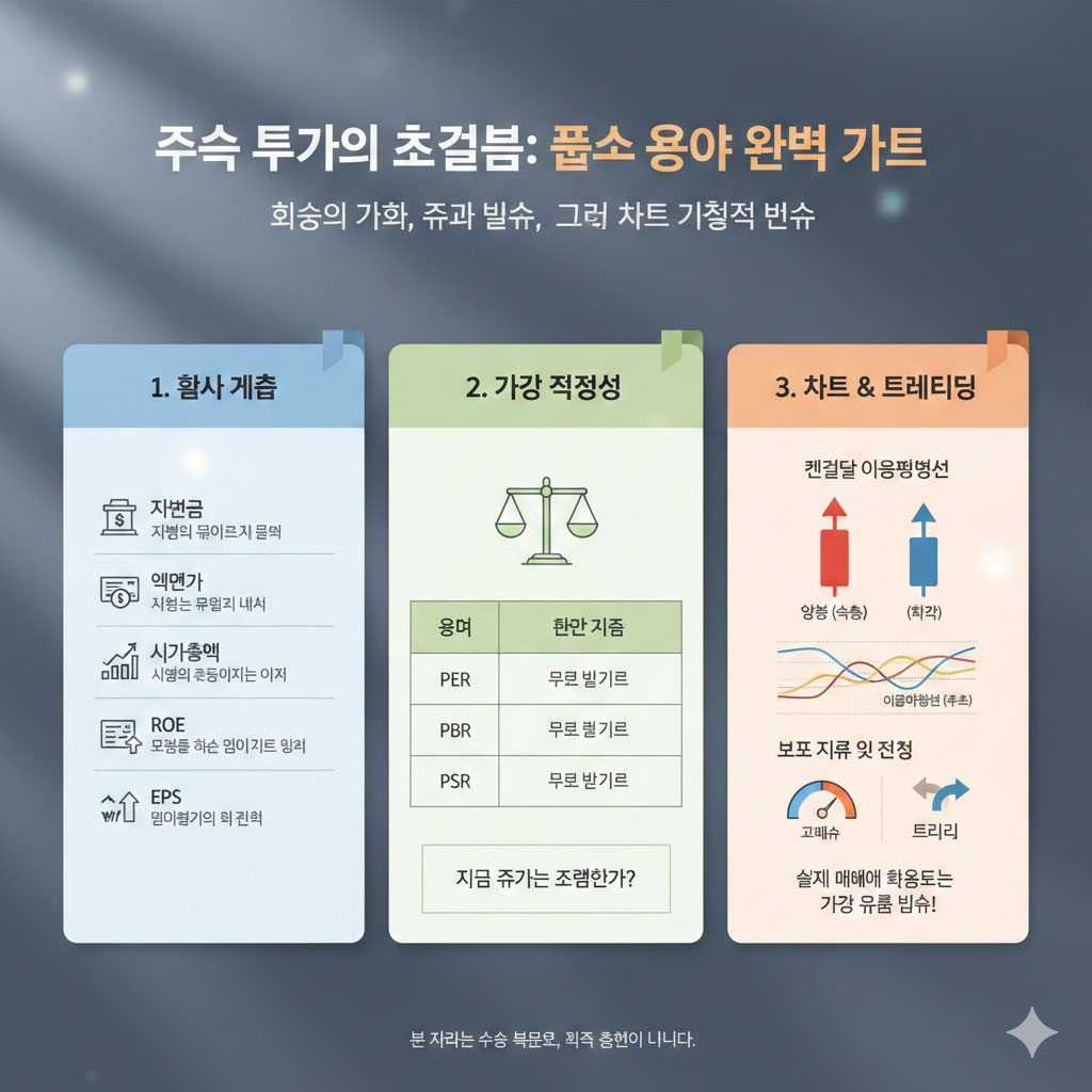 주식 투자를 처음 시작할 때 마주하게 되는 필수 용어들을 회사의 가치, 주가의 저렴함, 그리고 차트의 기술적 분석 세 가지 테마로 나누어 알기 쉽게 정리해 드립니다.
