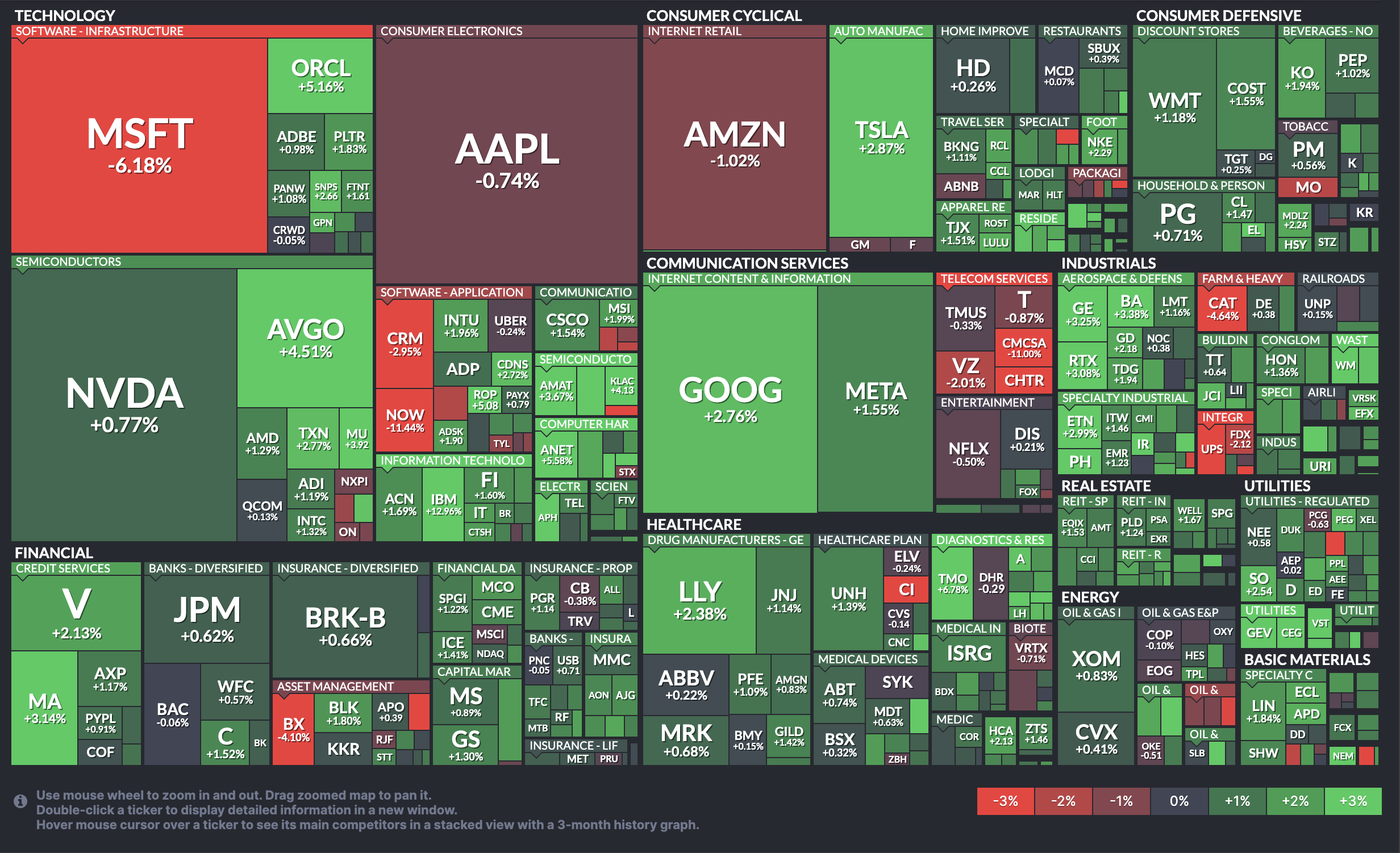 • Interactive Heatmaps: A signature feature that provides a color-coded map of the S&P 500 and global markets, allowing you to spot sector strength or weakness in seconds.