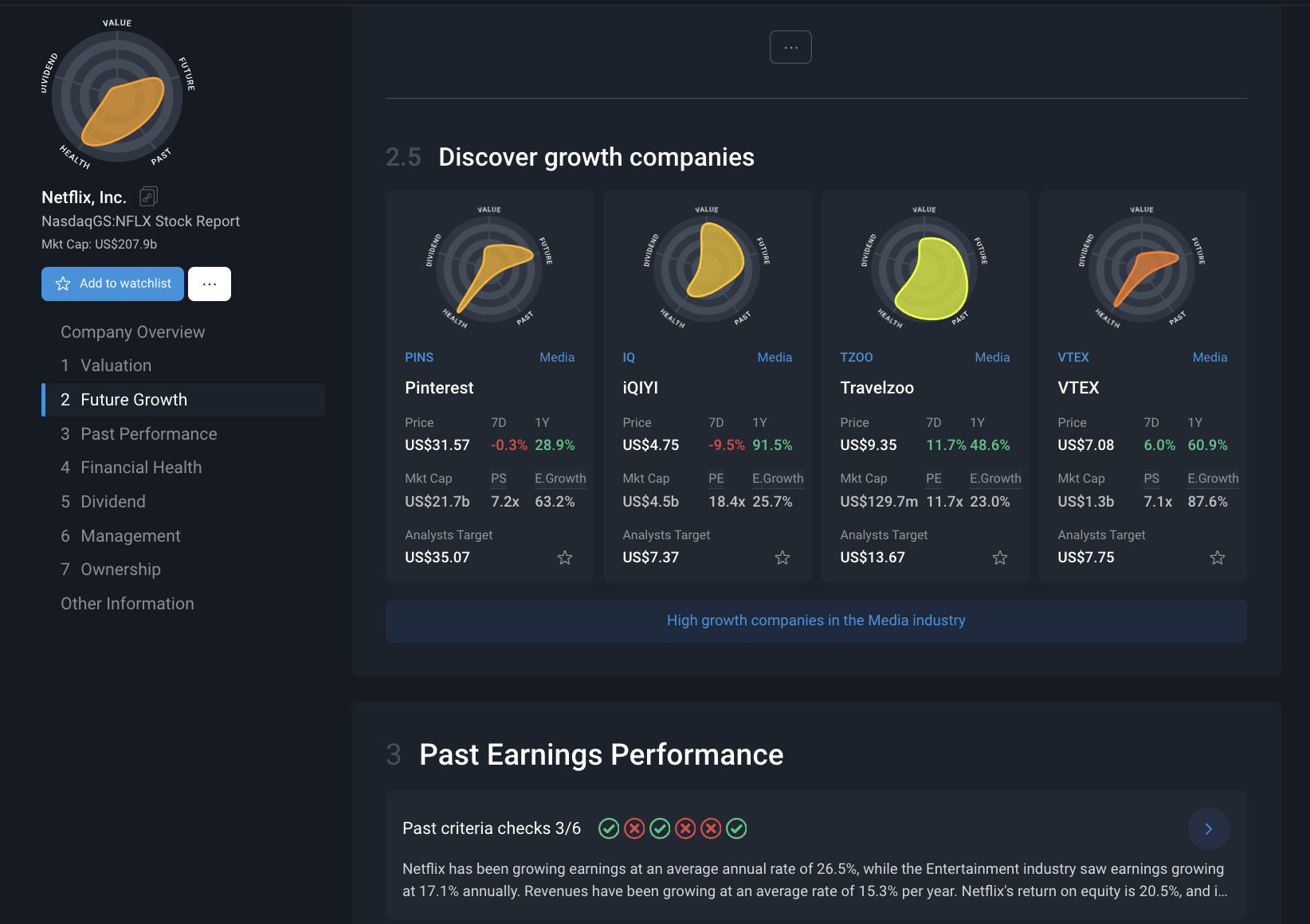 • Narratives: A newer feature that allows you to build an investment thesis. It lets you adjust growth and risk parameters to see how they impact a stock’s “fair value.”